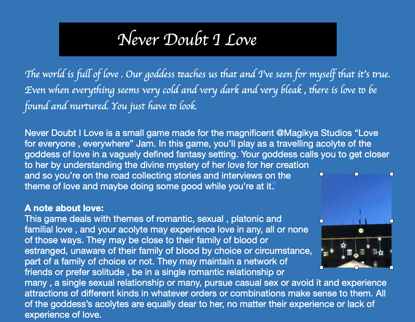 Never Doubt I Love is a solo TTRPG about exploring the nature of love from the perspective of a worshipper of the goddess of love. You'll meet people, hear the stories and add the tale of your adventures to your goddess's archives in the fullness of time. You might even do some good while you're out there , who knows?