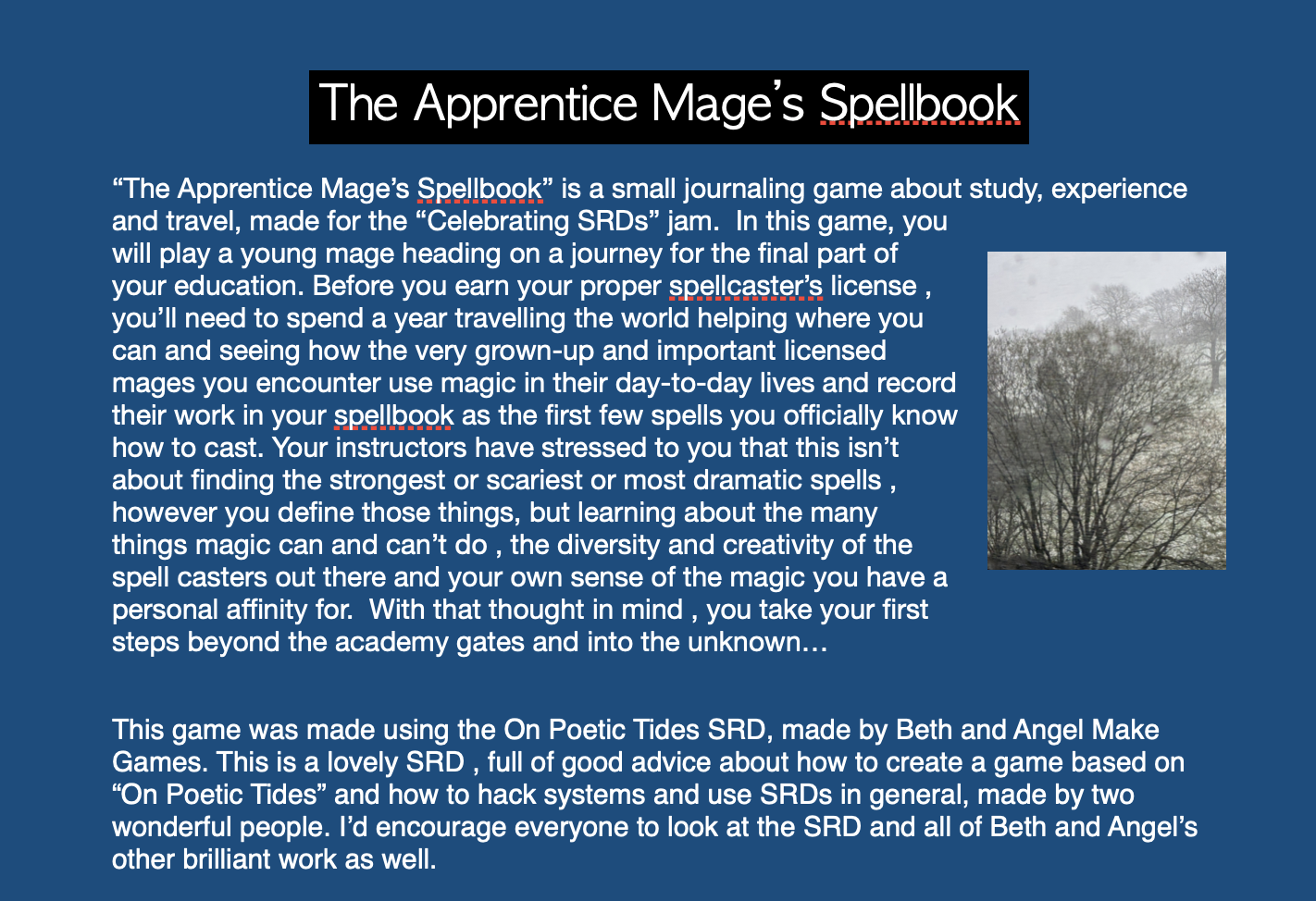 The Apprentice Mage's Spellbook is a small solo RPG of practical magical education in which you'll play as a student mage travelling the word and filling out your personal grimoire. Will you learn combat ice magic high in the mountains in winter or a spell to summon butterflies for the summer solstice festival? Or will you uncover an archmage or two and learn their signature spells? Only your spell book knows the answer..